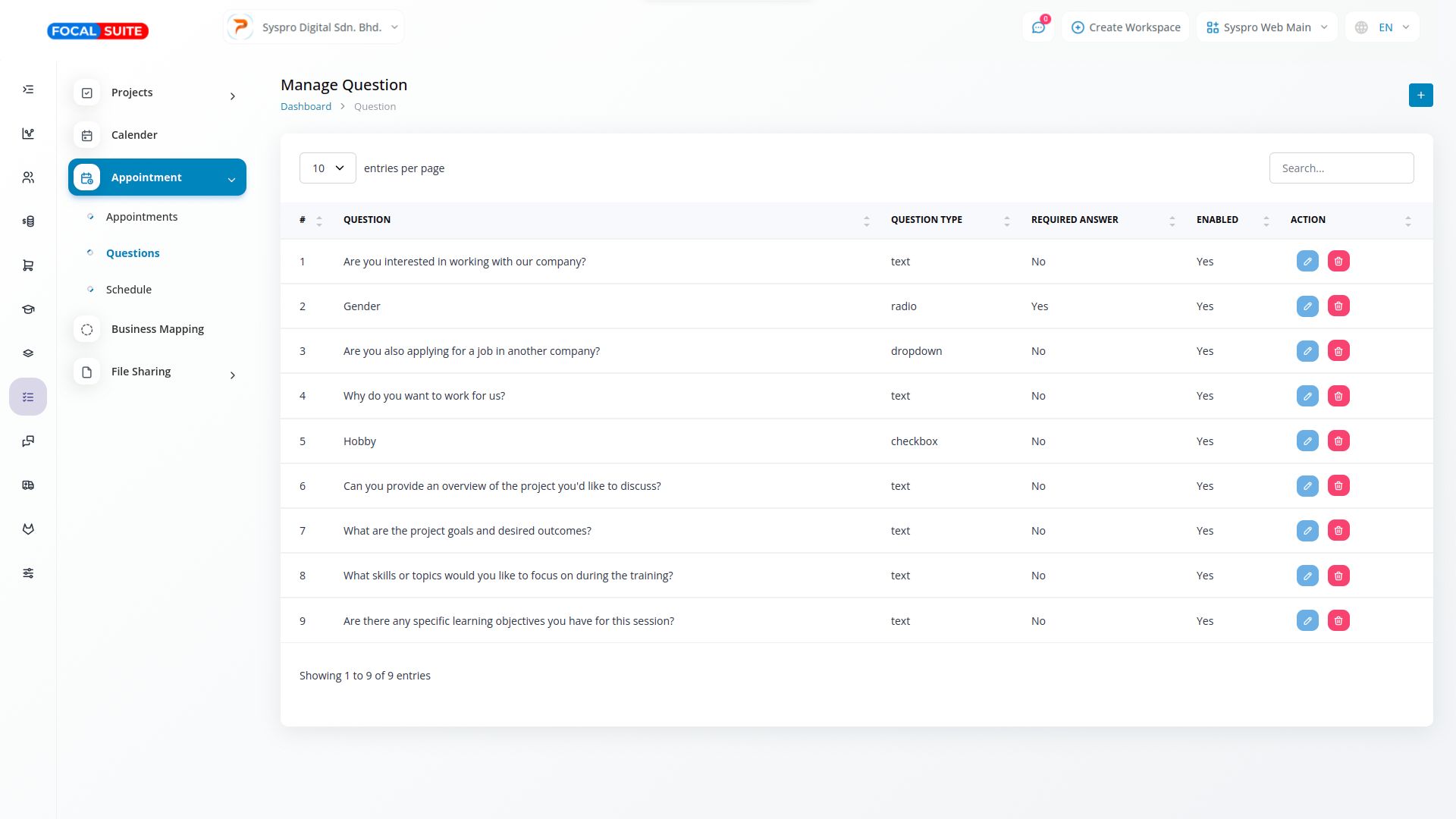 Simply select a field and choose the appropriate type from the list. There are four available field types: Text, Radio, Dropdown, and Checkbox. This allows you to display the question effortlessly. You can also decide if the question should be mandatory or optional and whether to include it in the appointment section.
