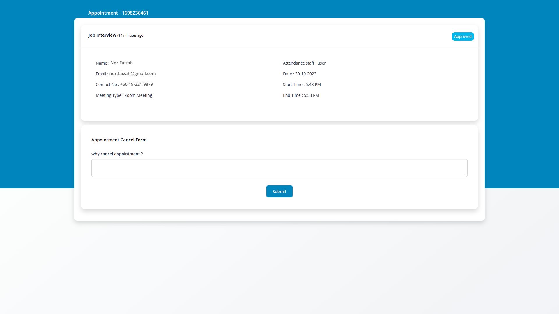 In the schedule section, the details of the completed appointment form are displayed. Here, you can change the appointment status, with options to approve, reject, assign users, mark appointments as complete, and send feedback forms after completion. Once an appointment is approved or rejected, the appointee will be notified via email. A feedback form will also be sent upon completion of the appointment.