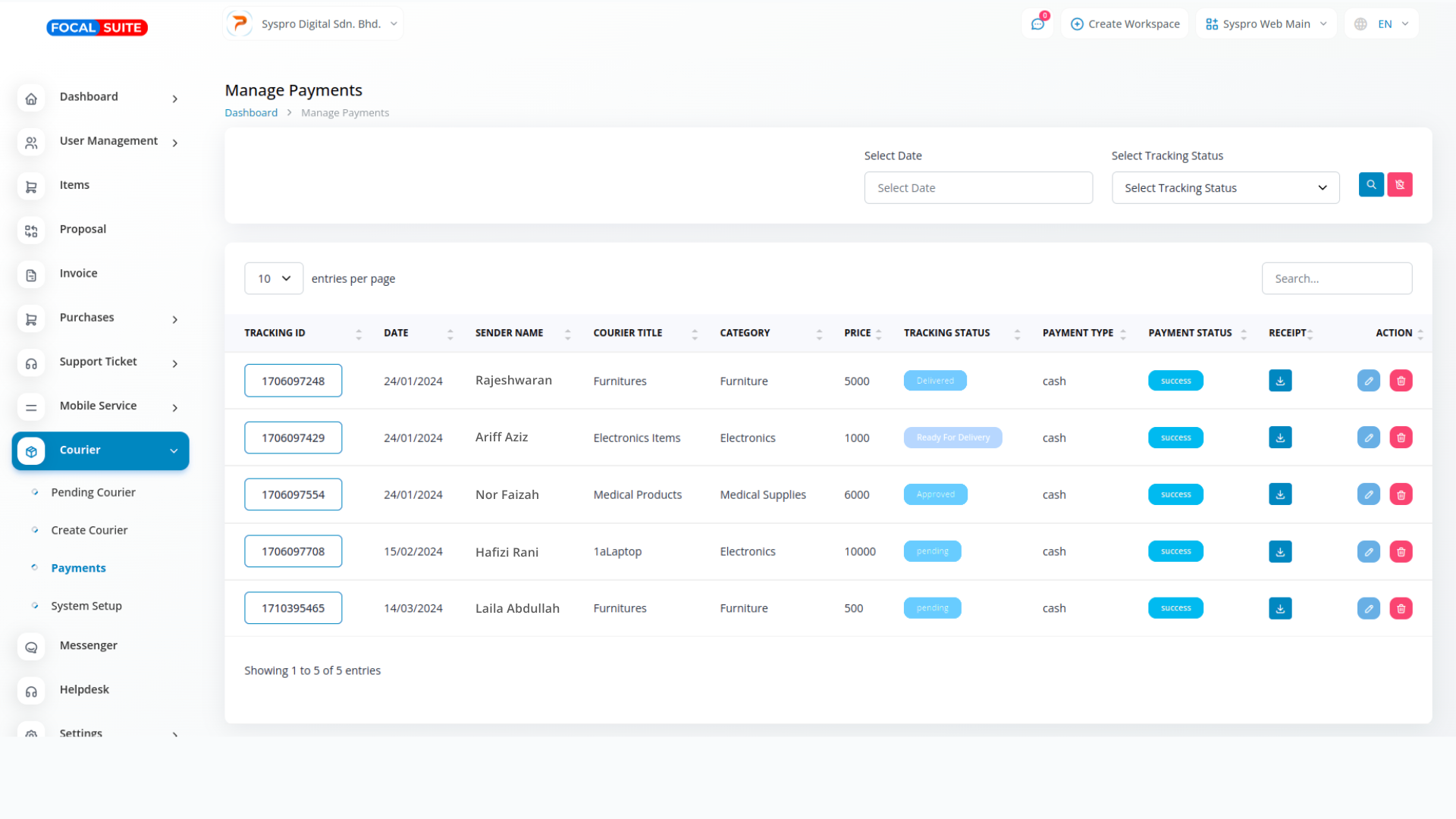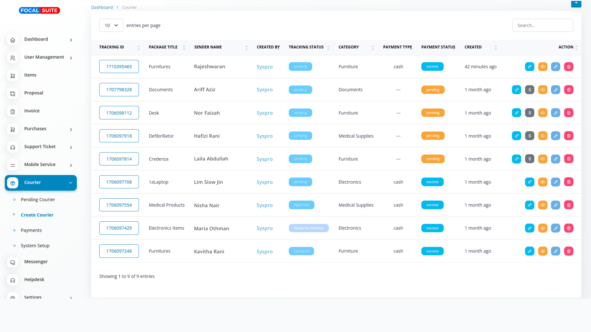 The Courier Management module in Focal Suite is a dedicated tool designed to streamline and optimize all courier-related processes. At its core is efficient order processing, enabling users to input and manage orders with complete details—including sender information, recipient details, and parcel specifications. This ensures a smooth, accurate, and reliable order flow, forming a solid foundation for effective courier operations.