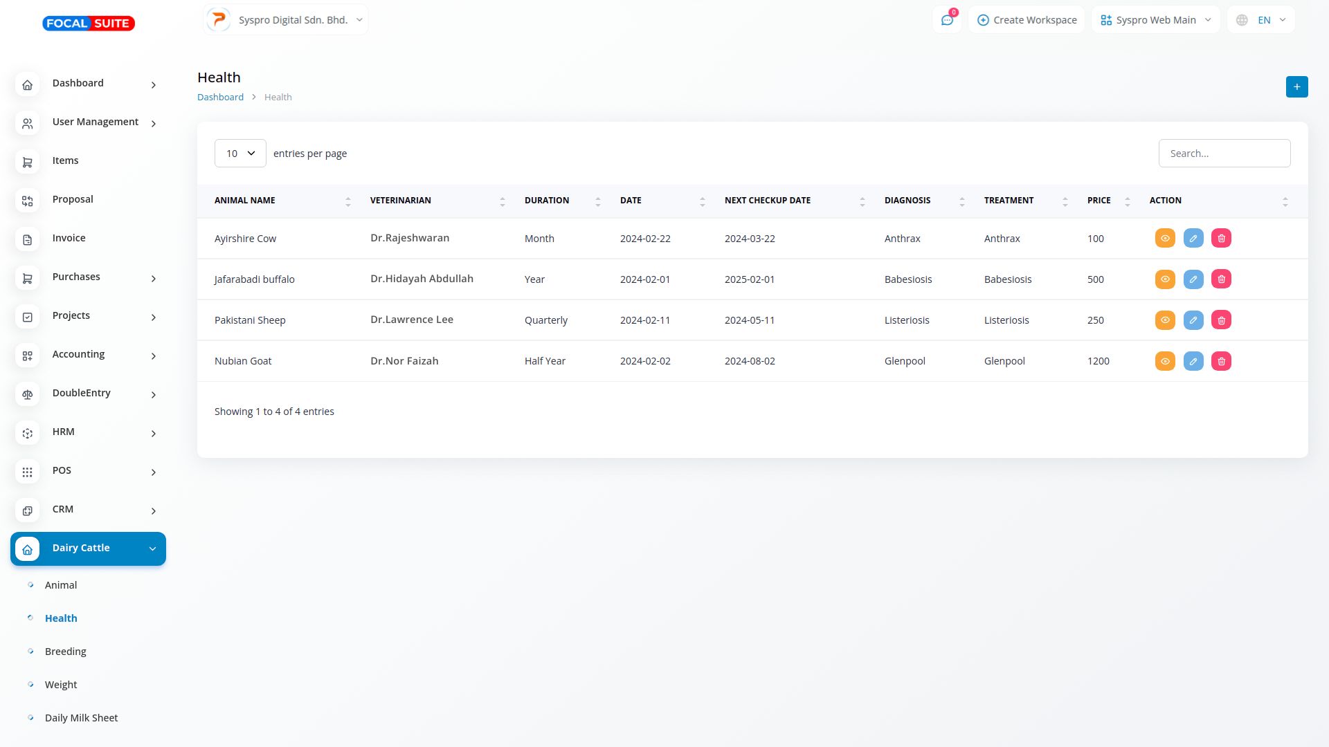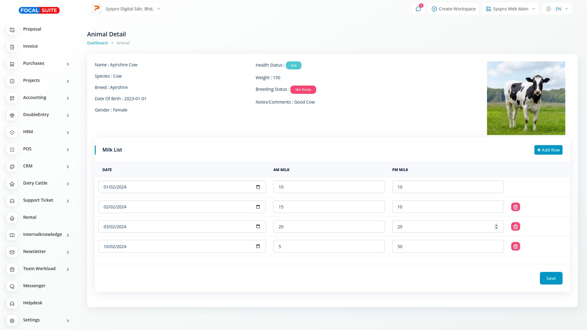 The Dairy and Cattle Management module in Focal Suite is your all-in-one solution for managing dairy cattle operations. Designed to streamline the complexities of dairy farm management, Focal Suite offers seamless integration for key tasks such as animal health monitoring, breeding management, weight tracking, daily milk yield recording, and milk inventory management. With Focal Suite, you can efficiently manage every aspect of your operations, ensuring the health of your herd while optimizing productivity.