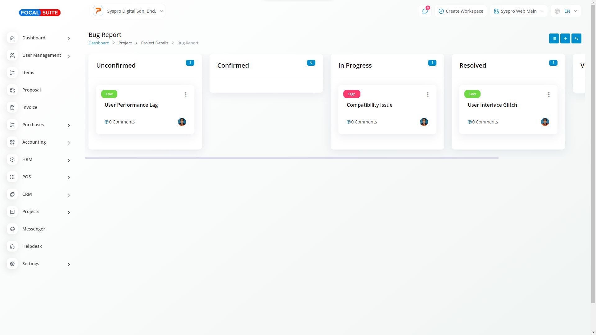 Create new bugs and assign users and priority to them. You can write a note in the text box for the bug description. Also, the status of each bug could be changed through an easy drop-down and Kanban drag system.