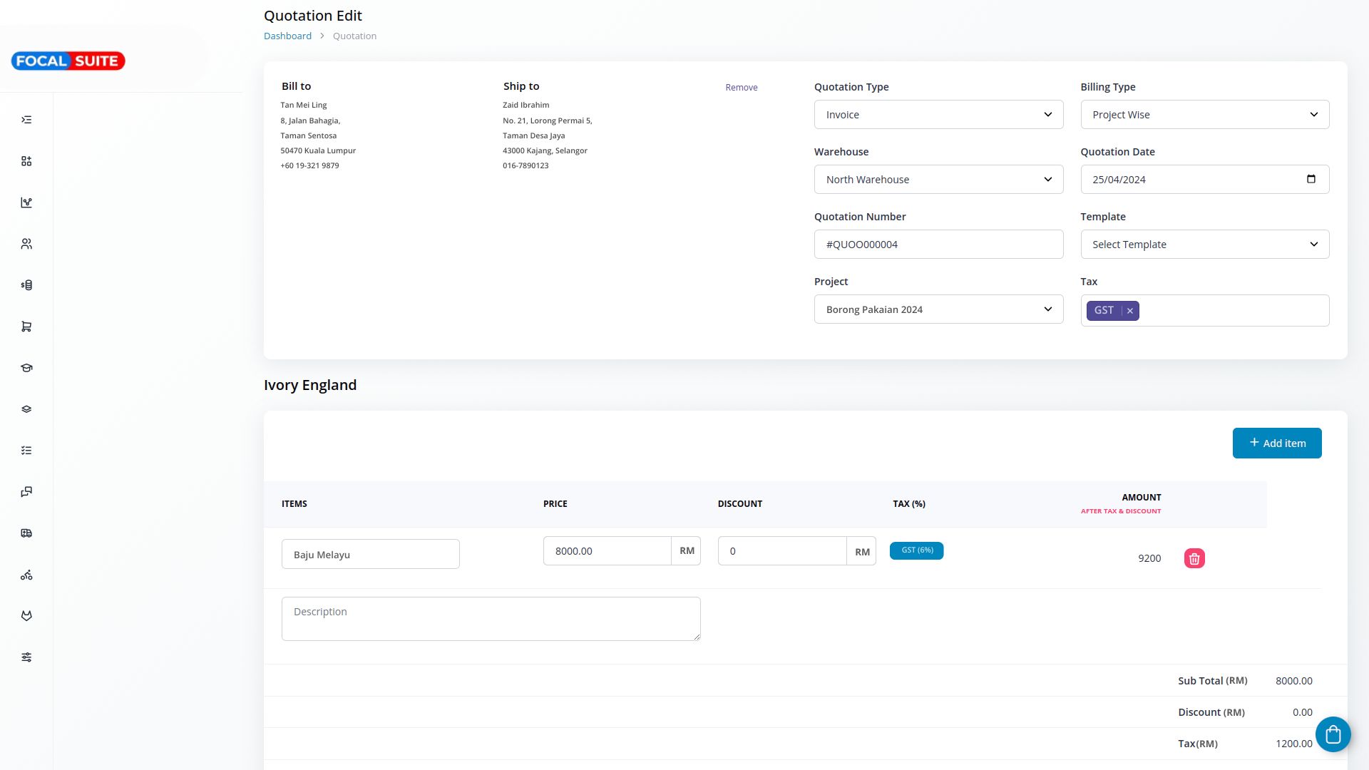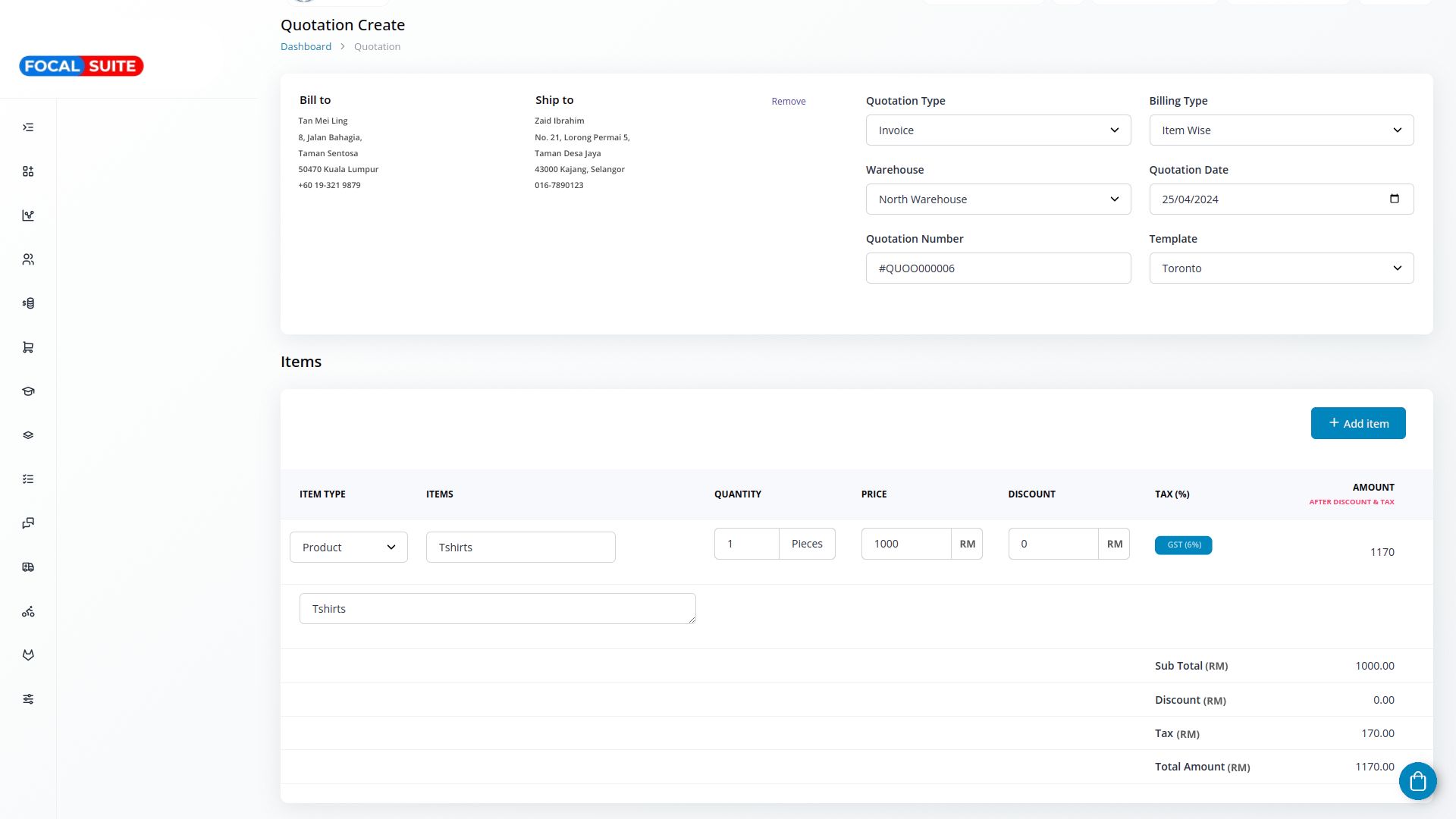 Quotation management is essential for any business, impacting customer perception, revenue generation, and overall efficiency. With Focal Suite, you can transform your quotation process, making the creation, tracking, and conversion of quotes into invoices seamless. Our comprehensive quotation module includes a variety of features designed to streamline your workflow and boost productivity.
